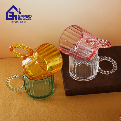 Inci kolu ile 315ml sıcak satış kaplı kabartmalı tasarım renkli cam kupa